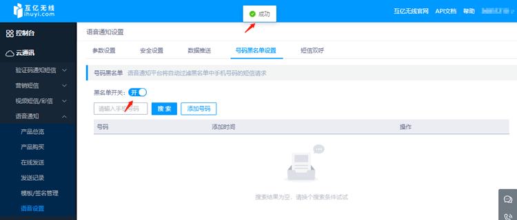 語音通知短信黑白名單管理 路徑[控制臺(tái)>語音通知短信>短信設(shè)置],右側(cè)中[號(hào)碼黑名單設(shè)置],可對(duì)對(duì)應(yīng)功能進(jìn)行調(diào)整配置。
